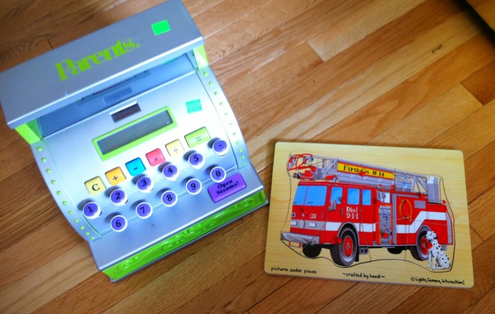 We headed over to the kids’ store next where Jax is allowed to explore and play. They allow that there, as long as you clean up afterwards. I found him a toy cash register that is basically a huge solar powered calculator. It has some laminated play money in it, but no coins. It is by Battat toys and Parent’s magazine and is no longer sold. It was $2.75. For $0.75 more, I got a wooden fire engine puzzle to put with Jax’s other wooden puzzles in his room.