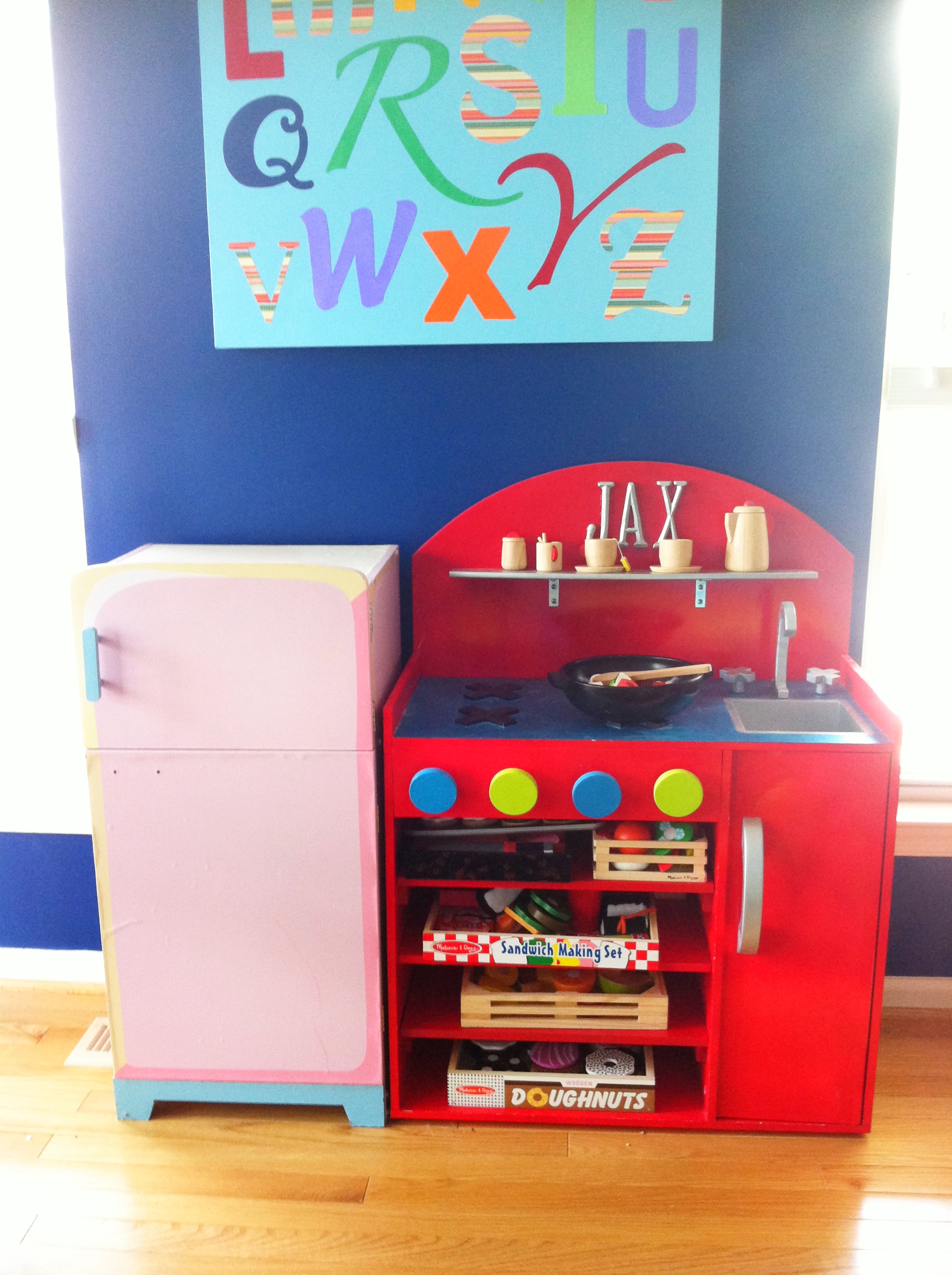 We pulled up to the thrift store and were greeted by a huge heap of large children’s toys outside by the donation drop off area. I wasn’t sure if it was just a staging area or if everything was for sale. Some things were priced, but others were not. My eye was drawn straight to a pink wooden fridge. Yes, yes, yes! Ever since I got Jax his little kitchen and gave it a makeover, I’ve been hoping a wooden fridge would show up. It was packed tightly behind a air hockey table so I could only open the freezer. It had water damage like the other kitchen and a missing handle. (I realized the water damage is from the thrift store, not the previous owners. I’d thought it odd a wood kitchen had gotten wet, but it seems they leave them outside int he rain and just close the complex gate at night.) I was able to tell that both doors had working magnet closures and it sounded like there was a shelf rattling around in the bottom. It had a nice curve to the top of it that would help it match his stove.