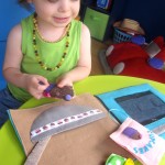 This page is another pretend play page featuring cooking (like out Let’s Cook Breakfast page.) The left side features an oven with a cupcake pan, the right side has a mixing bowl and recipe book. The recipe book holds cupcake making ingredients, and the mixing bowl stores cupcake parts and a spoon. There are three cupcakes: chocolate, strawberry and lemon, and they all come apart into three pieces. This is very good practice for manual dexterity. Jax can put the cupcakes in the cupcake tray, but he is still learning how to fit the frosting on top of the cupcake (it goes on like a hat.)