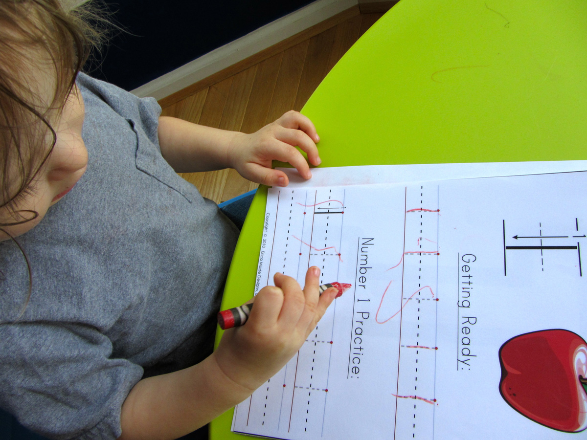 We did the same number tracing page that we did on Monday. I stuck a laminating sheet to the front of it so we could reuse it. Jax has trouble making the 1’s because I think he finds them boring. It is much more fun to scribble wildly and make big swooshes.