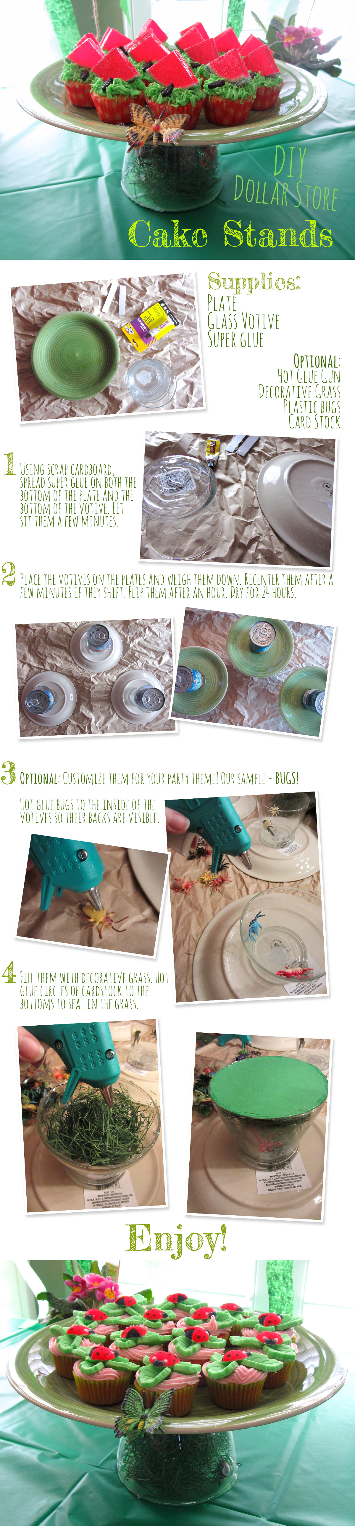 I’d seen plenty of Pinterest pins with candlesticks and plates turned into cake stands. I decided to put my own spin of the idea! I got three green plates, three glass votives and some Super Glue Bond-All, all from the dollar store. I had already ordered plastic bugs and found a bag of decorative grass at the thrift store for $1, but saw both of those things at the dollar store as well.