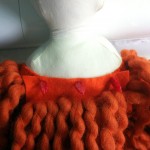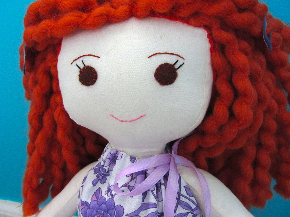 Curly red hair! Swoon! Beautiful, but how do you make it translate to yarn? I actually found the perfect yarn for A’s doll, and purchased it when it was 50% off (I used 1.5 skeins.) It’s Martha Stewart’s Lofty Wool Blend. I sewed my hair on differently than the pattern called for. More on that below.