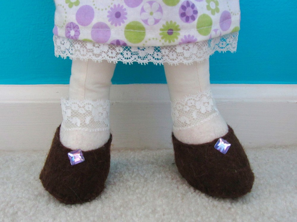 Both dolls got shoes, but I used the shoe pattern in two different ways. For A, I did brown 100% wool felt, with a white wool blend felt crescent sewn in to look like a sock. I added a ring of lace and a sew-on jewel to each.