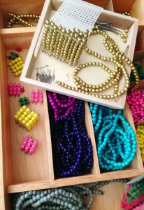 If you have a young child who is interested in math, the Montessori method of using beads to represent quantities is a great place to start. This is a part of the whole “concrete to abstract” formula Montessori uses. The Montessori bead materials allow a child to experience the difference between 1, 10, 100 and 1,000 with his own hands.