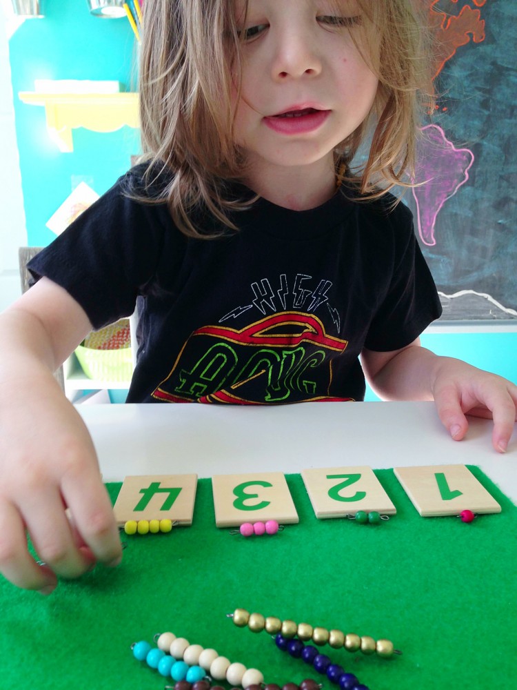 There are online resources that can show you the proper way to introduce the bead materials. I really like Info Montessori. Jax is a creative learner, however, so I often let him lead our activities after I’ve presented the basics. At the moment we are focusing on counting quantities with the golden beads and practicing the the bead stair. He is dying to move on to the addition snake game, but I want him to have a better grasp on the basics first. We’ve done a few simple addition games, though!