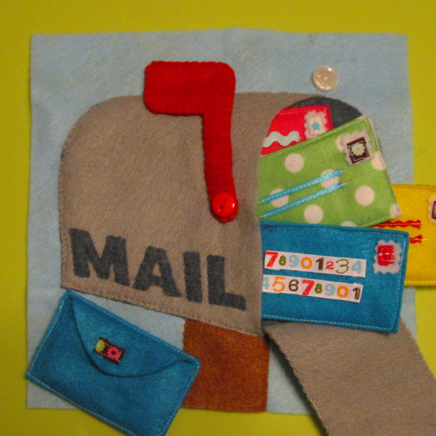To make the page: I stared by sewing the two sides of the red flag together. I installed a grommet at the end – the same kind I use on the finished pages. I then sewed the lettering down onto the side of the mailbox. Placing the flag where I wanted it, I sewed on a button through the grommet hole. This lets the flag move just like on a real mailbox. To make the mailbox door, I sewed the two sides together with a loop of ribbon at the top. You could use elastic as well. I sewed the brown stake to the page, followed by the dark gray mailbox interior (the dashed line on the pattern shows where I sewed a decorative line to add dimension to the inside). I sewed the top, back and bottom of the outside of the mailbox down leaving the front open to put the letters in. To finish the page, I sewed down the bottom of the mailbox door and attached a button above it.