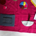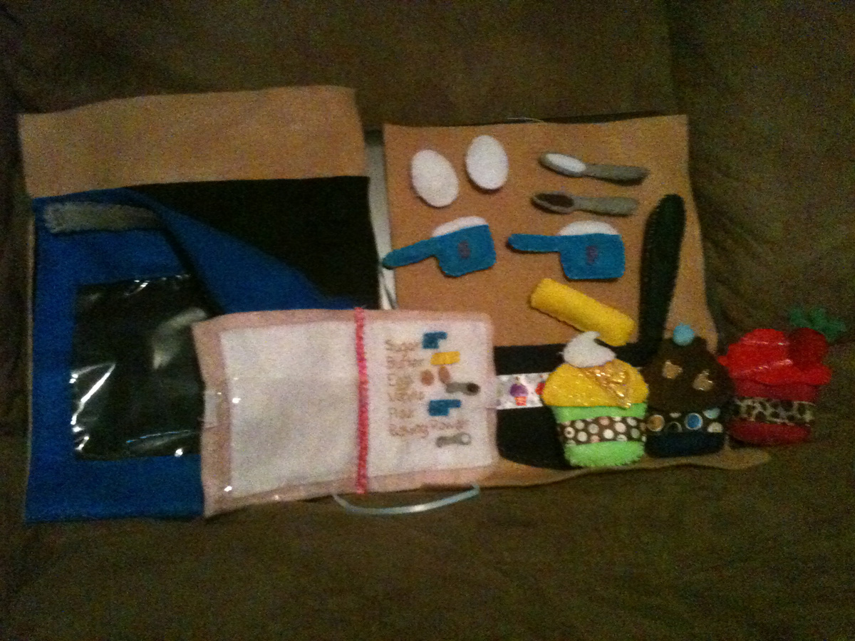 My goal was to make this page even more interactive by making the eggs open with the yoke inside and I liked the idea of being able to take the butter out of the wrapper. I used a lot of clear vinyl which a got from clear pencil bags from target. I didn’t want to take the extra time to embroider the ingredients so I just printed it out, colored it and sewed it behind the vinyl. Super easy! I wanted to add the cupcake stand page because I wanted a place to show off the cupcakes after they had been decorated! (See more here.)