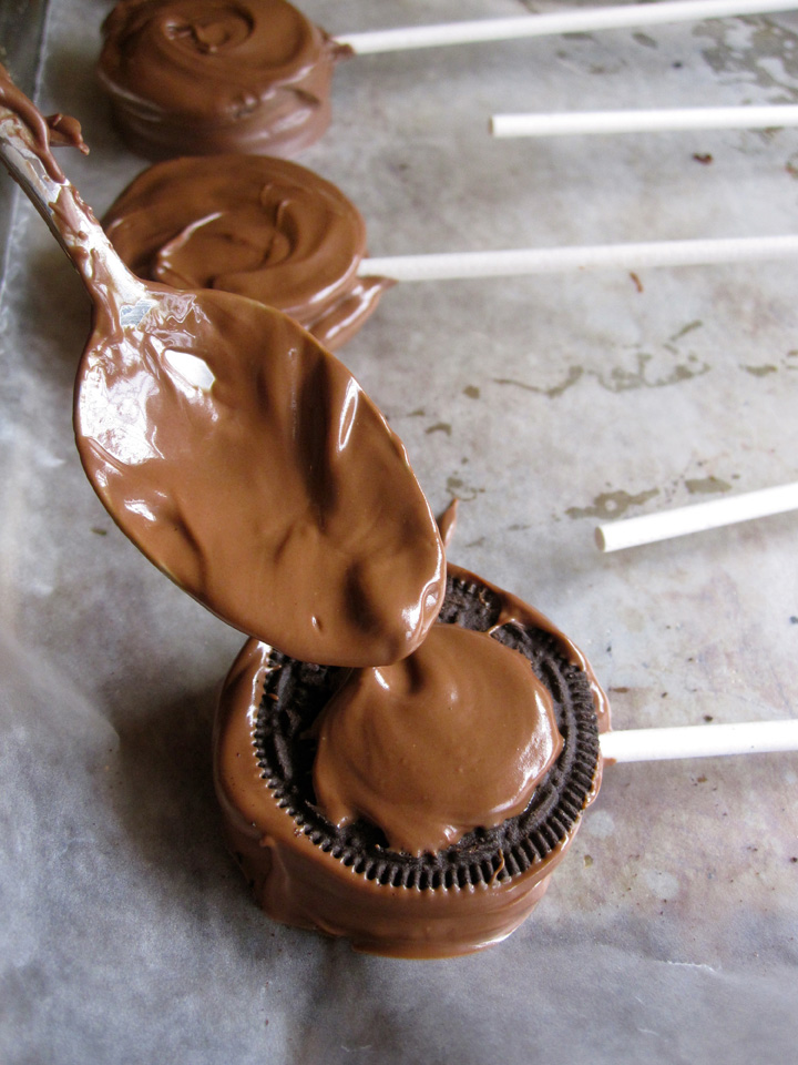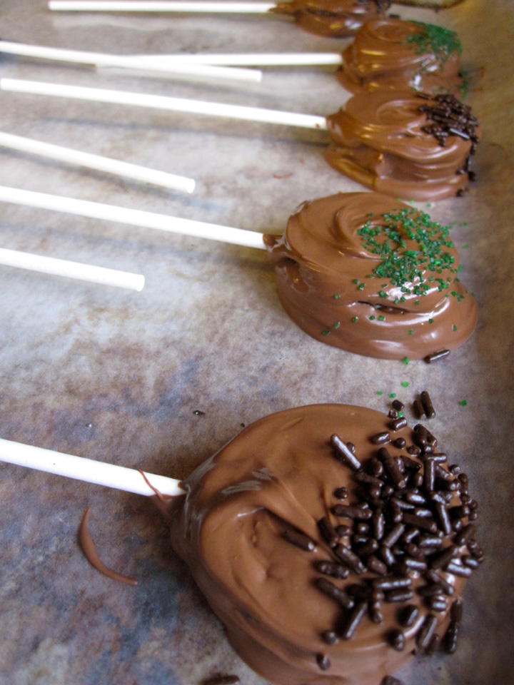 We let our paint dry for a couple hours while we ate dinner, then tied loops of bakers twine for hanging. If you use ribbon, you might need larger holes. The holes shrink a bit as the ornaments bake.